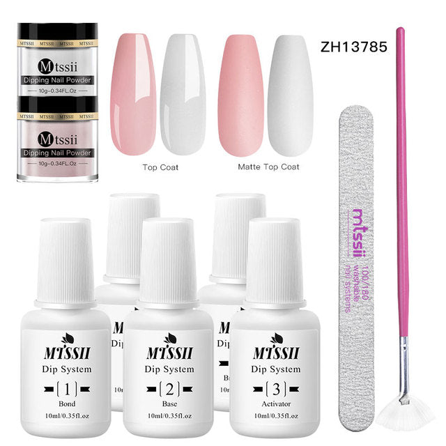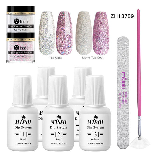 Mit unserem Dip-Powder-Kit können Sie bequem von zu Hause aus trendig bleiben und die perfekte Maniküre kreieren. Das Set enthält alles, was Sie brauchen, um Ihren Look zu vervollständigen, einschließlich Unterlack, Decklack, Aktivator und Pinsel.